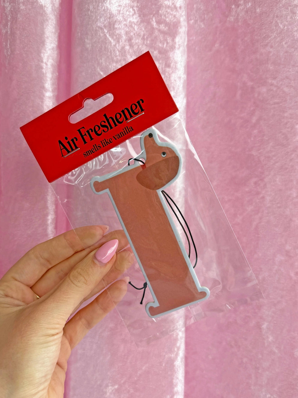 This dog's got more bark than bite! This air freshener is shaped just like a dachshund! If you want your car to smell good, we're paw-sitive this good boy will do the trick! Vanilla scented and comes with an elastic cord to loop around a rearview mirror. Measures 4" x 3.5" and is double-sided.
