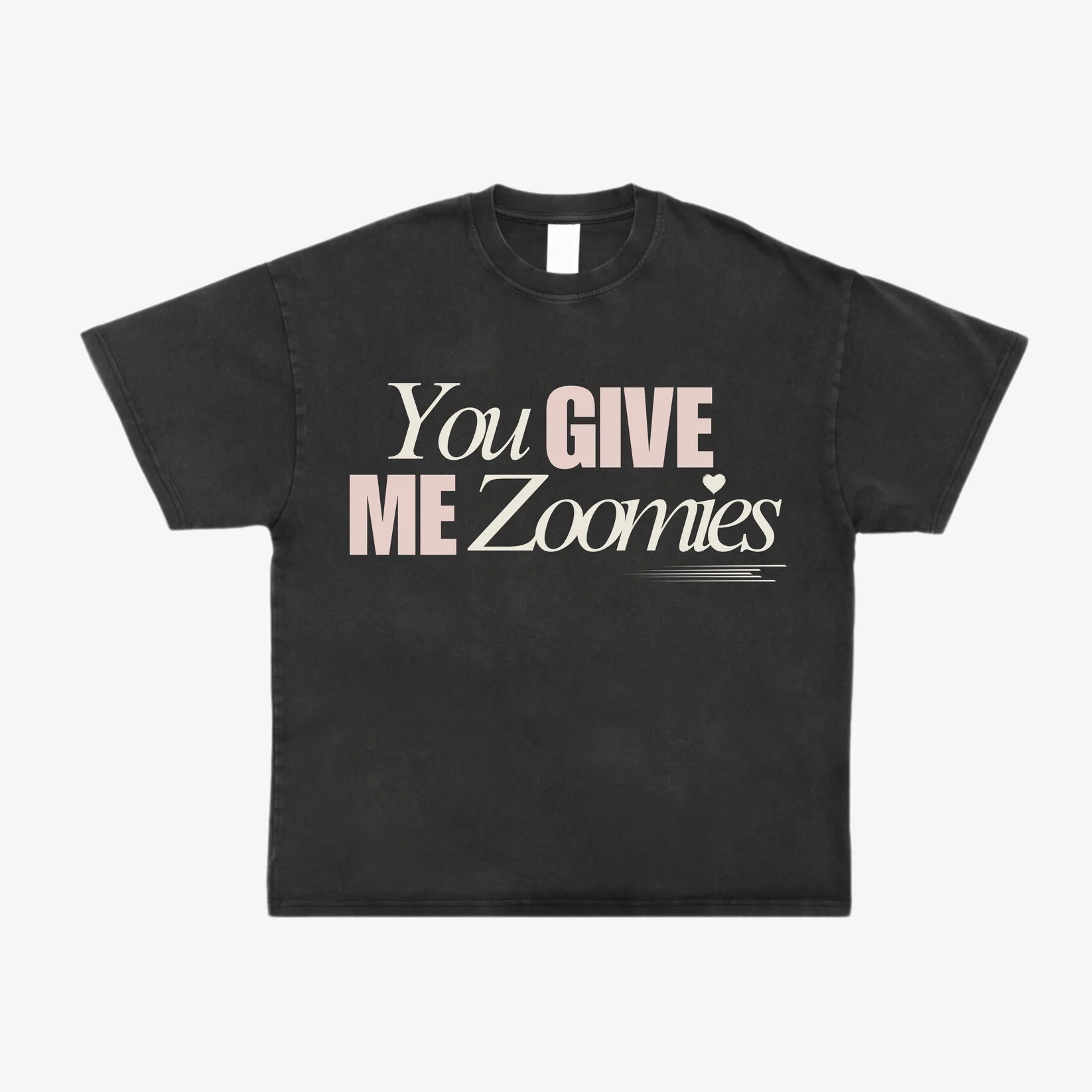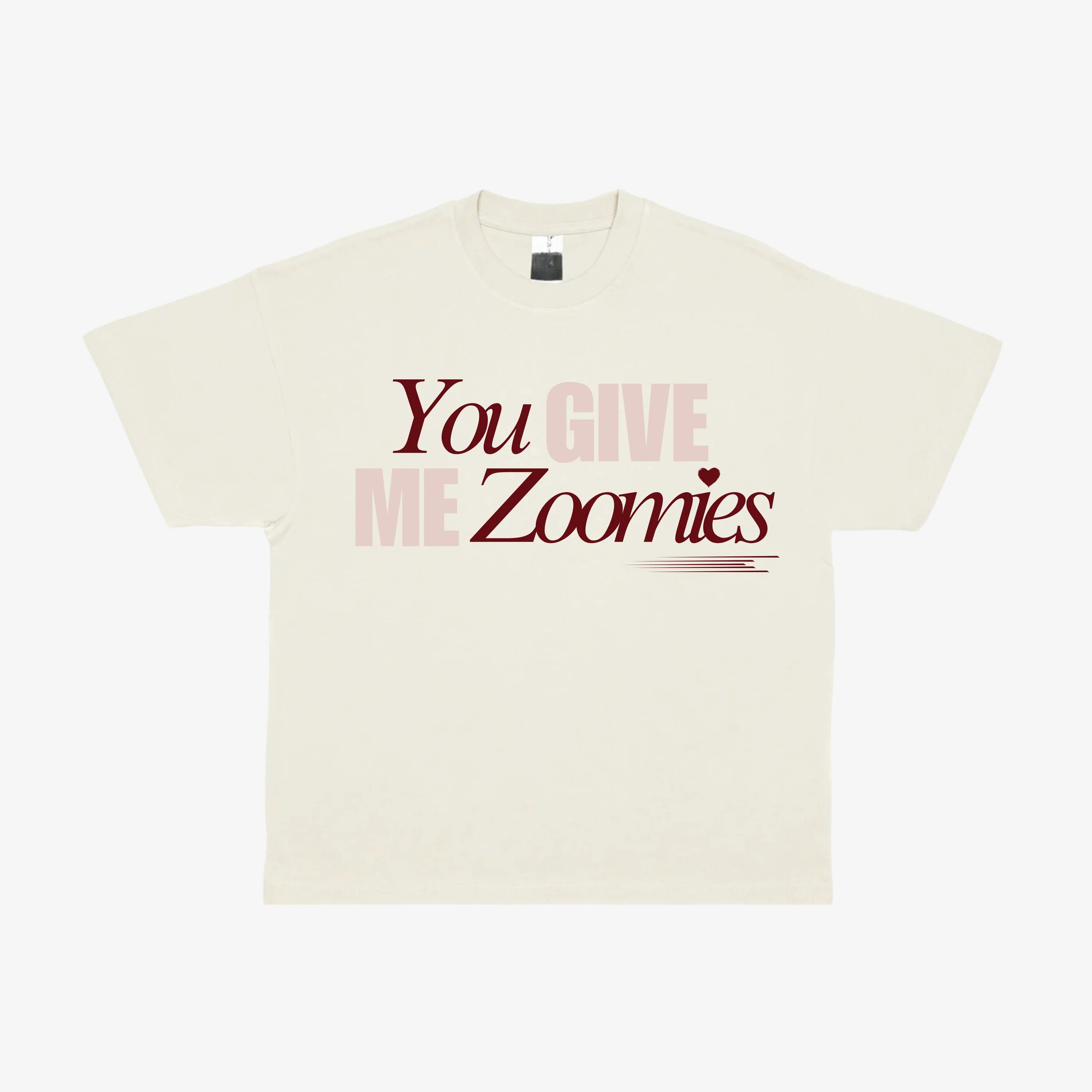 Our "You Give Me Zoomies" tee features a graphic on the front centre chest.