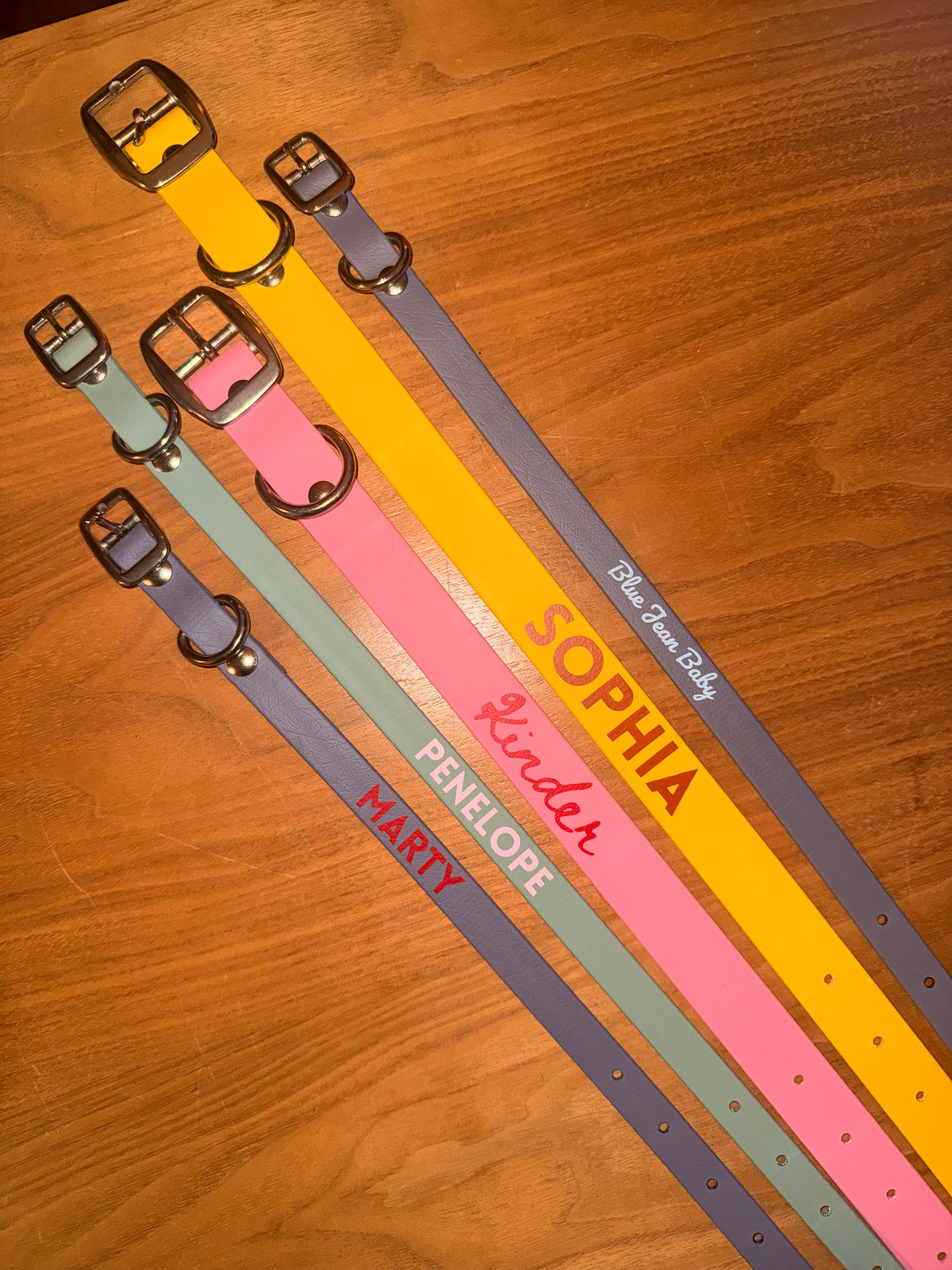 Your dog's favorite collar - personalized! Our classic waterproof biothane collar, but customized with your dogs name in vinyl. Please fill out this form after placing your order for your customization.
