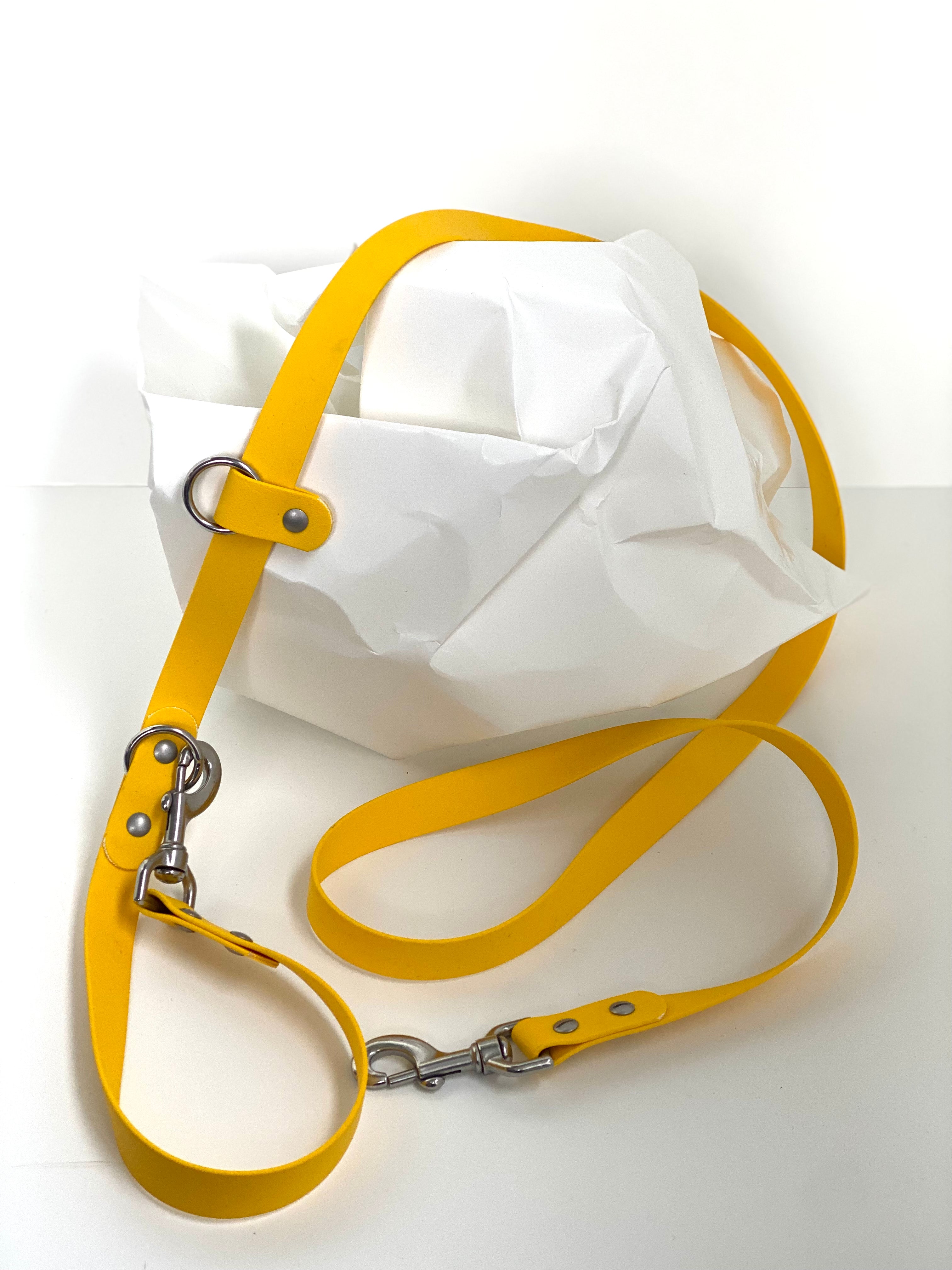 Biothane looks and feels like leather, but it is made with a PVC outer layer and nylon core. Biothane is very durable and has been tested with real dogs and horses :) It can get wet, muddy, dragged, pulled - it is built to last!